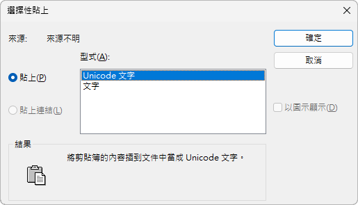 顯示將剪貼簿的內容貼到目前圖面時,所能使用的各種格式。
