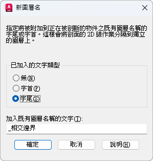 指定是否向剖面圖塊元件的圖層名稱加入識別文字,或指定加入識別文字的方式。