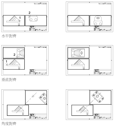 對於角度對齊、水平對齊與垂直對齊,您可以相對於由顯示的模型空間幾何圖形定義的距離來移動每個配置視埠。