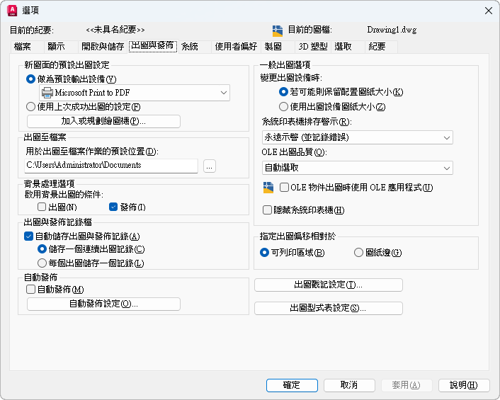 指定是否將圖面自動發佈成 DWF、DWFx 或 PDF 檔。您還可控制用於自動發佈的選項。