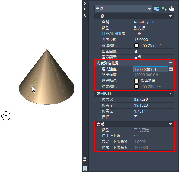 當圖面照明單位為光度控制時,衰減類型性質會停用。光度控制光源具有固定的、平方反比衰減。