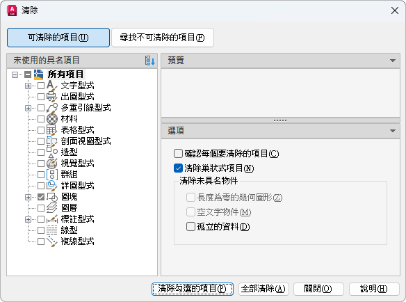 在左側的樹狀檢視窗格中列出目前圖面中可以清除的項目。在對話方塊右側的「清除未具名物件」窗格下,可以移除圖面中的其他項目。