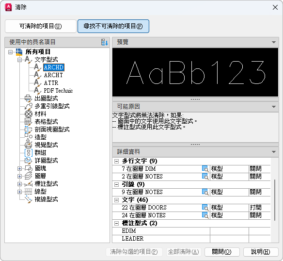 大多數物件目前正在圖面中使用,或者是不能移除的預設項目。當您選取個別具名物件後,會顯示有關該項目無法清除之原因的資訊。