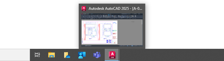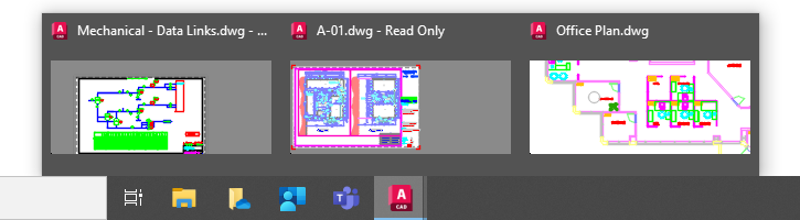 註: Windows 提供一個設定,用於合併同一個程式多個執行中例證的工作列按鈕。工作列按鈕合併後,合併的按鈕會根據程式每個例證和這些程式的目前 AutoCAD 工作列設定顯示預覽。例如,如果 AutoCAD 工作列設定設為 0 且有兩個 AutoCAD 例證正在執行中,則無論在每個例證中開啟多少圖面,您都會看到兩個預覽。