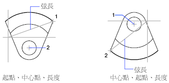 起點和中心點之間的距離決定半徑。弧的另一端透過指定弧的起點和終點之間的弦長來確定。