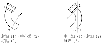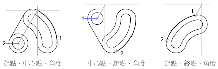 由指定中心點、端點、起點、半徑、角度、弦長與方向值的各種組合,來建立弧。