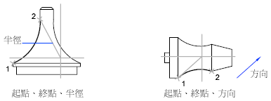 可找到所需切線上的一點或輸入一個角度來指定切線方向。您可以變更指定兩個端點的順序,來決定控制切線的端點。