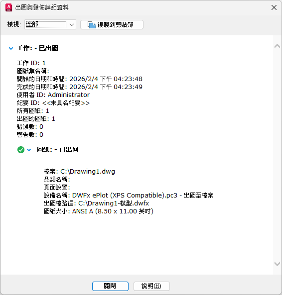 顯示所有已完成的出圖與發佈工作,以及這些工作內圖紙的相關資訊。