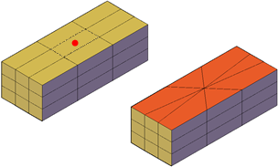 由於您指定了分割的起點和終點,所以此方式也可讓您控制兩個新面的造型。可使用「頂點」選項,自動鎖點至面的頂點。如果您打算分割一個面以建立兩個三角形面,然後旋轉這兩個三角形面的邊 (MESHSPIN),請使用「頂點」選項來確保精確度。