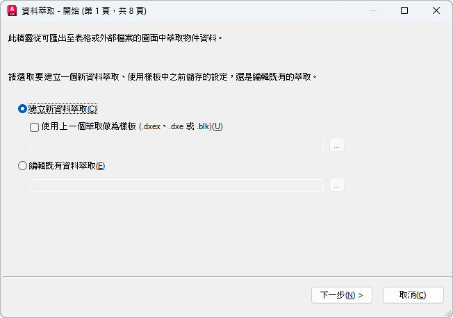 建立新資料萃取並儲存為 DXEX 檔。您也可以指定一個先前萃取的檔案 (BLK、DXE、DXEX) 做為樣板檔。