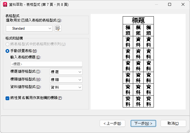 可手動輸入標題以及標題、標頭和資料儲存格型式的規格。