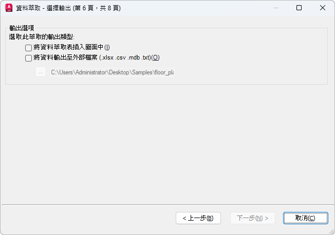 此資訊用於在目前圖面中建立資料萃取表,或被儲存至外部檔案,或二者皆有。