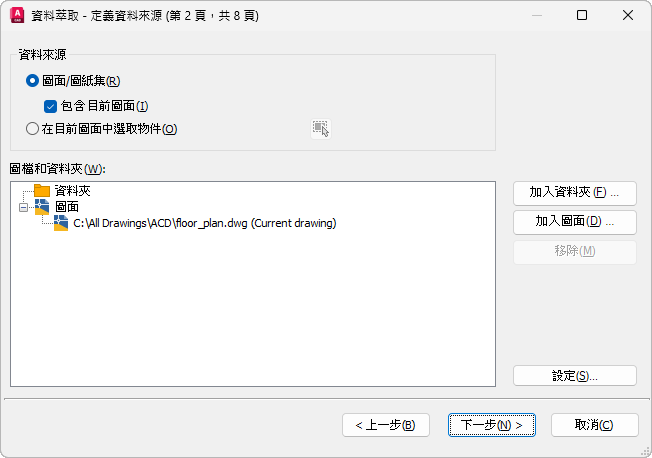 顯示「加入資料夾選項」對話方塊,您可以在此指定要用於資料萃取的資料夾。監視所選資料夾中圖面的資料變更。