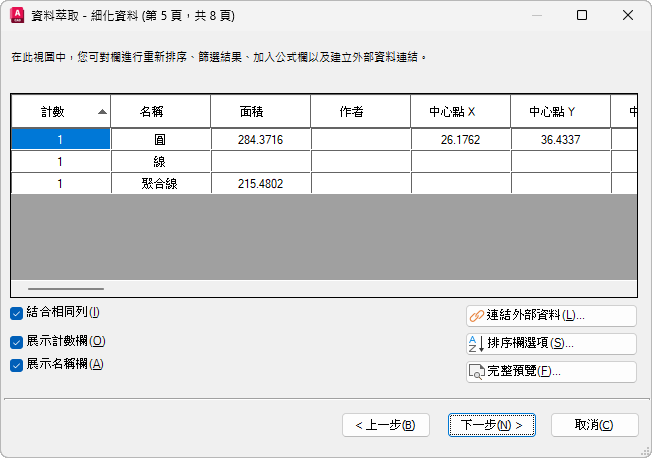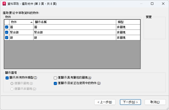 指定物件類型 (圖塊和非圖塊) 以及要萃取的圖面資訊。
