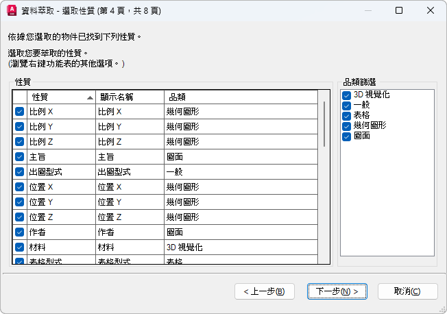 顯示從性質清單中萃取的品類清單。不勾選品類會篩選「性質」清單。品類包括 3D 視覺化、屬性、圖面、動態圖塊、一般、幾何圖形、雜項、樣式、表格和文字。