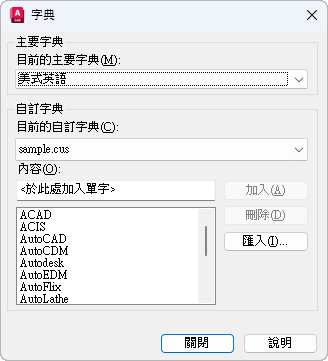 管理字典。在拼字檢查期間,使圖面中的文字與目前主字典和目前自訂字典中的文字相符。任何用「加入」選項識別的拼字異常都會儲存在您目前使用的自訂字典中。