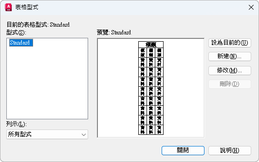 刪除在「型式」清單中選取的表格型式。但無法刪除圖面中正在使用的型式。