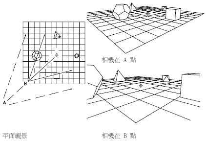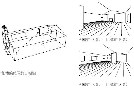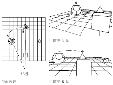 伸縮線會從目標點連接到十字游標,協助您相對於目標來放置相機位置。該圖解展示了相機與目標位置置換時,視圖中的變更。鏡頭和距離設定則保持不變。