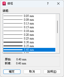 顯示先前的線粗。建立圖層時指定的預設線粗是 DEFAULT (按預設值 0.01 英吋或 0.25 mm 出圖)。(系統變數 LWDEFAULT)