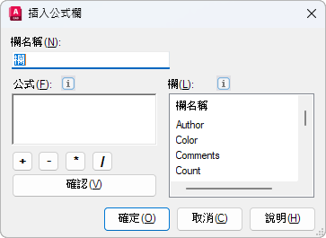 顯示萃取的圖面資料和外部資料之欄名稱 (如果已經建立資料連結)。可以按兩下欄名稱將其加入公式欄位,或將其從「欄」清單拖曳到「公式」欄位。既有公式欄未列示且不能用作建立其他公式欄的值。