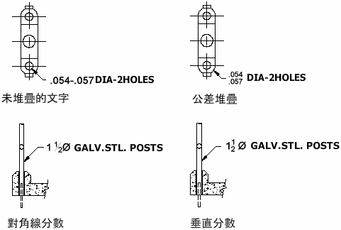 堆疊文字參照已套用至多行文字物件和多重引線內的字元的分數和公差格式。表示分數和公差的字元可格式化以構造若干標準。