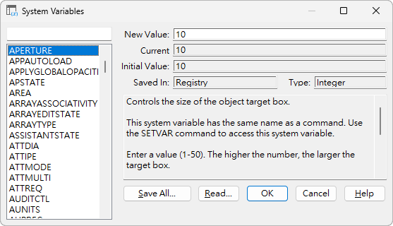 | Initial Value | 顯示亮顯於清單方塊中系統變數的初始值。此即為新圖面中的系統變數值。 |