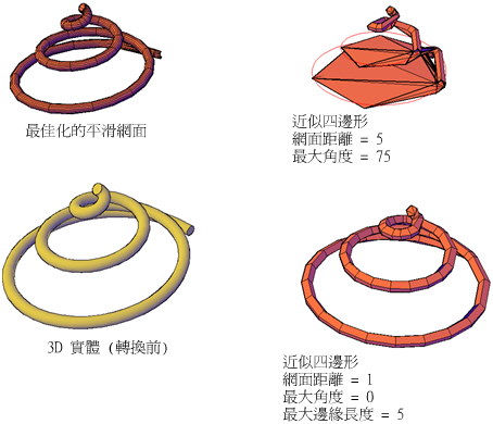 您也可以透過設定新面的最大距離偏移、角度、縱橫比和邊長度,來控制與原始造型的接近程度。以下範例展示使用不同鑲嵌設定將 3D 實體螺旋線轉換為網面的情形。最佳化的網面版本已被平滑化,但其他兩個轉換沒有平滑度。但是請注意,使用較小鑲嵌值進行的近似四邊形轉換建立的網面物件與原始版本最接近。平滑化此物件更能改進外觀。