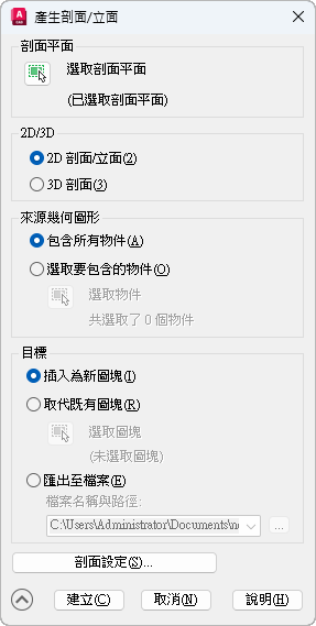 將產生的剖面做為圖塊插入目前圖面。