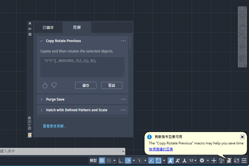 您一開始可以從「見解」頁籤嘗試並評估新的指令巨集。按一下「嘗試」可啟動指令巨集,根據該指令巨集,系統可能會提示您提供輸入,例如指定點或選取物件。如果您發現指令巨集有用,可以儲存它以便稍後從「已儲存」頁籤執行或編輯。儲存後,您可以按一下其關聯的按鈕來執行指令巨集。