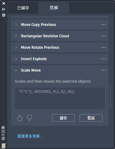 「指令巨集」選項板會顯示先前儲存的指令巨集建議,以及根據您在產品中執行的指令順序識別的新指令巨集建議。