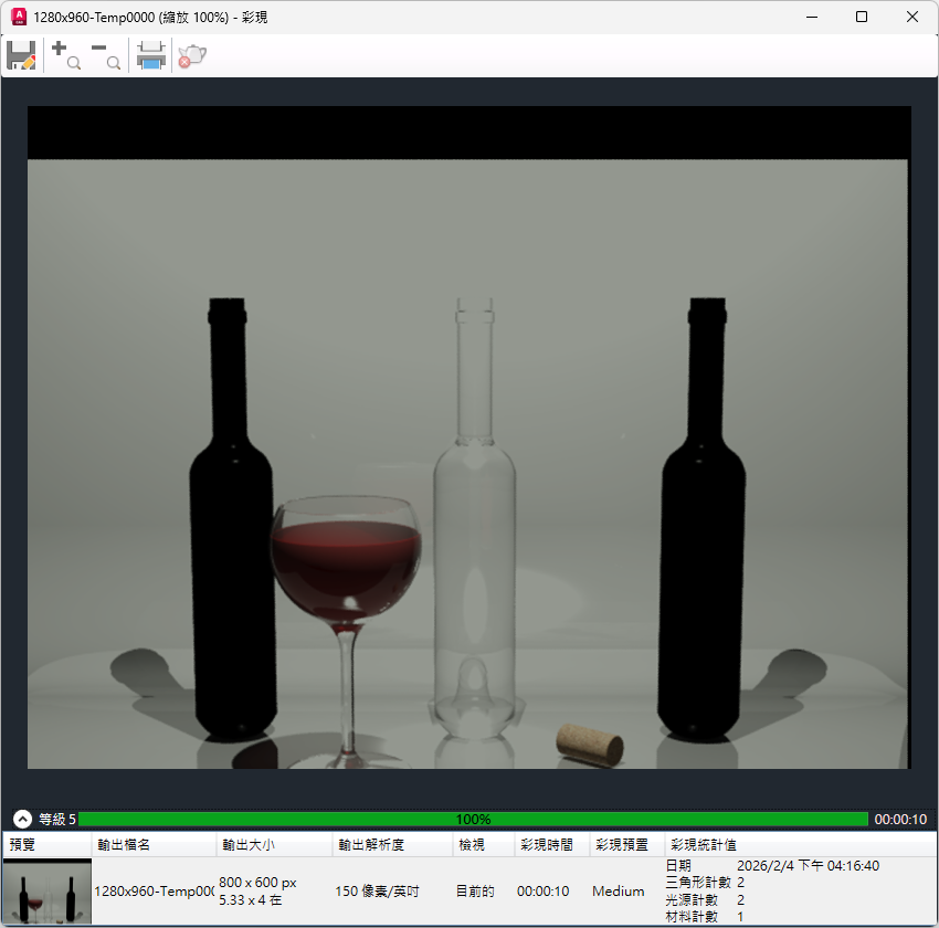當您彩現至「彩現」視窗時,不能使用 SAVEIMG 指令。這個指令僅適用於視埠中的彩現。
