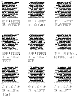 根據文字邊界,決定新文字或所選取文字的文字對正方式與文字流向。會將目前的對正方式套用至新文字。在指定的矩形中,文字基於對正方式設定與矩形上九個對正點之一來對正。對正點基於用來指定矩形的第一點。文字為正中、靠左或靠右對齊與左右文字邊界有關。輸入在行末的空格包括部分文字且影響行的文字對正。文字流向根據其上下邊界控制文字是與段落中央對齊,還是與段落頂端或底端對齊。