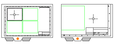 在下方左側的「配置」頁籤範例中,目前的 配置視埠會呈現亮顯,您可以在其中平移和縮放模型空間的區域。在右側的範例中,在配置視埠外按兩下會將您導向至圖紙空間,您可以在其中平移和縮放整個配置。這是如何放大標題欄框區域的方法。