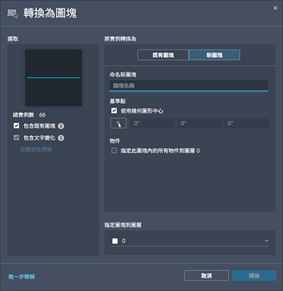 您也可以將來源物件或選取的實例轉換為新圖塊。在「轉換」對話方塊中,透過指定圖塊名稱和插入點定義新圖塊。插入點預設會設定為選取的幾何圖形中心。