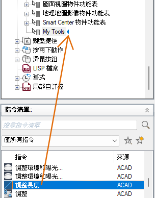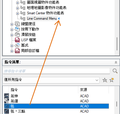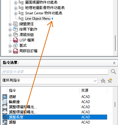 - 在「指令清單」窗格中,將要加入的指令拖曳至「<檔名> 中的自訂」窗格中的快顯功能表。
