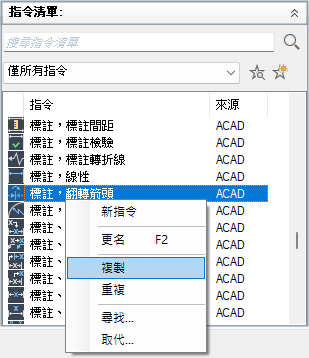 - 在「自訂」頁籤的「指令清單」窗格中,尋找您要複製的指令。