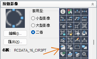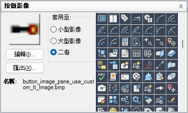 在「按鈕影像」窗格中的「套用至」下,選取以下三個影像指定選項之一:「小型影像」、「大型影像」或「二者」。然後選取您從影像清單匯入的影像。