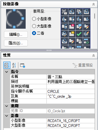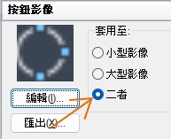 在「按鈕影像」窗格中的「套用至」下,選取以下三個影像指定選項之一:「小型影像」、「大型影像」或「二者」。