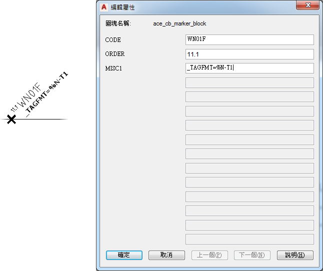 註: 在標識圖塊上定義的屬性值將取代所有定義在工作表中的值。