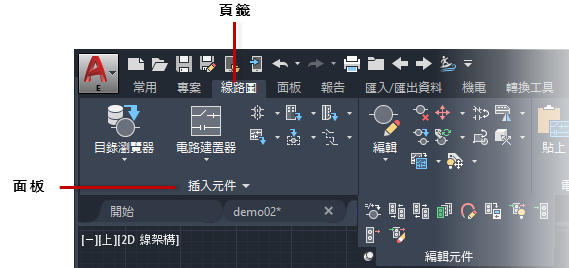 「電路建置器」中,「線路圖」是頁籤的名稱,「插入元件」是頁籤上面板的名稱,「電路建置器」是指令的名稱。