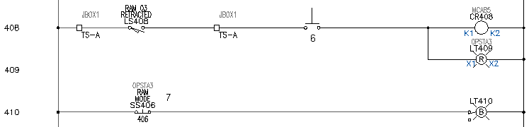 在此練習中,您需要使用虛線連結線將插入的選擇開關連結至位於線參考 406 至 408 處的既有 RAM MODE 選擇開關。