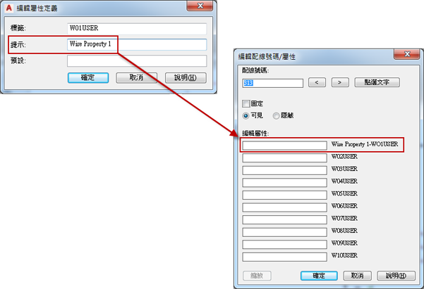 水平和垂直配線號碼圖塊必須具有「線號」屬性。圖塊也可以具有 W01USER-W10USER 屬性,這些屬性可用於為配線指定多種性質。如果您為配線號碼圖塊上的任何 W01USER-W10USER 屬性定義提示值,當您編輯配線號碼以指定值時,這些提示將包括在標示中。