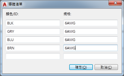 按一下以開啟「導體清單」對話方塊,您可在其中加入導體和定義每個導體的顏色和規徑。