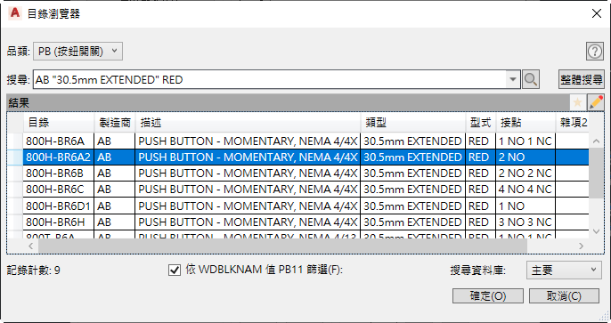 按一下「整體搜尋」,可在不同族群表中尋找特定的目錄、製造商或配件代碼值。例如,在 PB (「按鈕開關」) 和 LT (「燈、指示燈」) 表格中,「發光按鈕開關」記錄可能很常見。使用此功能,您可以檢查記錄是否已存在,從而避免重複的項目。