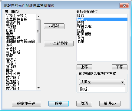 「描述 1」將移至「要報告的欄位」清單中。這些是將顯示在「元件報告」中的欄位。