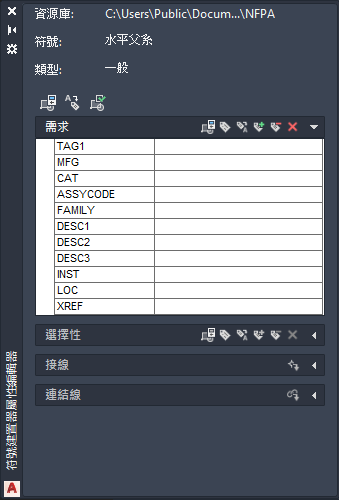 在自訂符號中加入屬性「標籤 1」、「描述 1」、「位置」、「安裝」、「族群」、「製造商」、「目錄」和「配件代碼」。