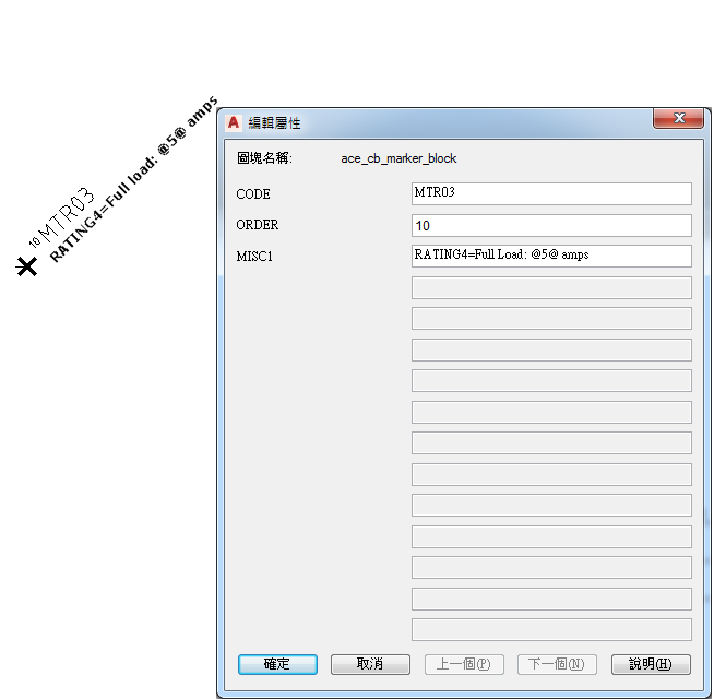 選取馬達電路後,將呼叫特殊馬達設置/註解功能。此特殊功能由具有標籤值的樣板上的標識圖塊以旗標方式標記,該值對映至 UI_TITLE 欄位中標記有「!MCC_CTRL」的電路代碼表單中的行。此功能參考 ace_electrical_standards.mdb 檔案以決定已選取的一組馬達輸入參數的目前滿載值和配線大小值。