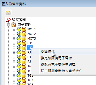 「已匯入線束資料」對話方塊中的瀏覽器節點包含從 AutoCAD Electrical toolset 匯入的電氣元件和配線。
