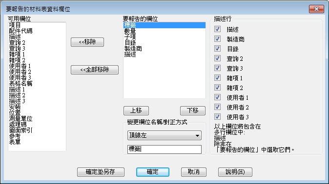 在「要報告的材料表資料欄位」對話方塊的「要報告的欄位」區段中,將顯示構成材料表格式的欄位。