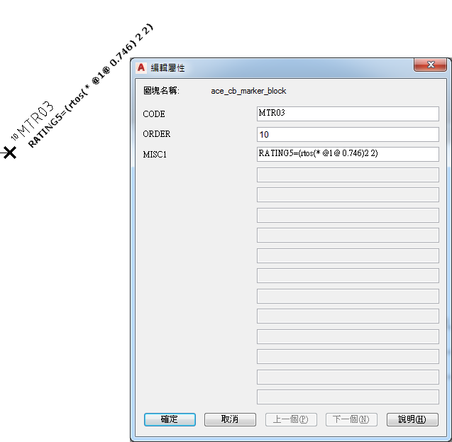 - 使用格式「{屬性名稱}=(AutoLISP 表示式)」編輯其雜項 1 屬性值。例如,將 HP 值轉換成千瓦,並將此值放置到馬達符號的屬性額定值 5 上。在標識圖塊的雜項 屬性中輸入下表示式: